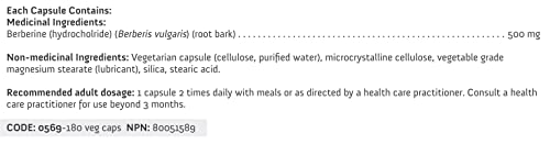 Ingredients: Medicinal ingredients: 5, 6-Dihydro-9, 10-dimethoxybenzog: -1, 3-benzodioxolo5, 6-a: quinolizinium 500.0 mg. List of non-medicinal ingredients: Carbohydrate gum, magnesium stearate, purified water, rice, starch, silica